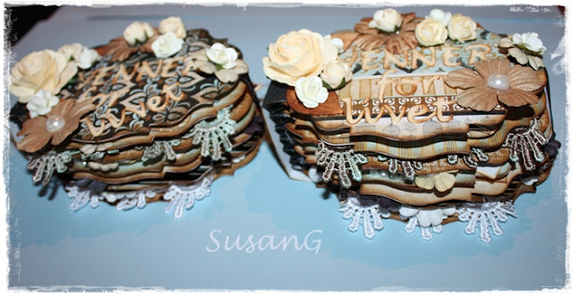 Albumene er laget helt fra bunn. Jeg har brukt Tim Holts Barouqe die for å lage sidene i albumen. Trykket de først ut i kartong fra tomme frokostblanding og ris bokser. Jeg hadde lyst å prøve å bruke en hel serie papir i disse albumene så jeg kjøpte en blokk med papir i designet Le Chateau Collection fra KaiserCraft. Blokken var i str 6 x 6. Jeg syns dette papiret var aldeles nydelig! Perfekt til sånne prosjekter. Det gikk utrolig fort å stanse ut sidene, da denne diesen trykker både 5 og 6 og sikkert flere ark i slengen...sånnt liker jeg!